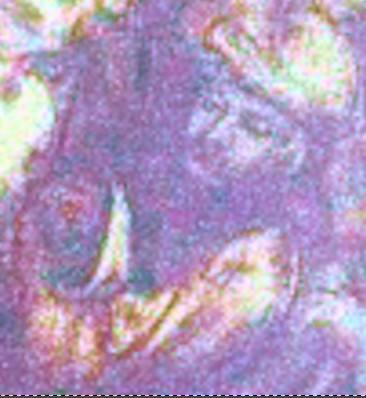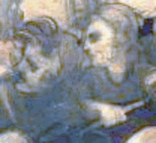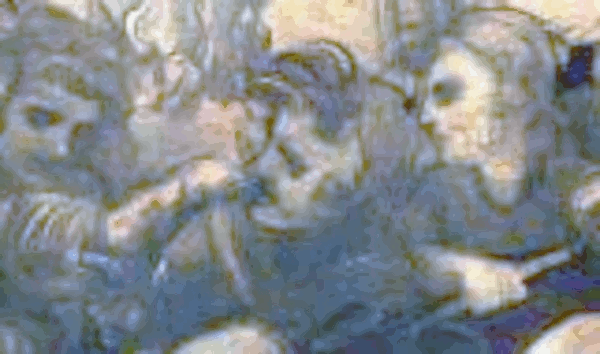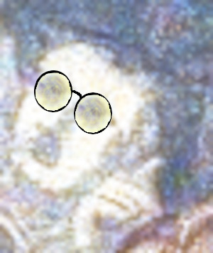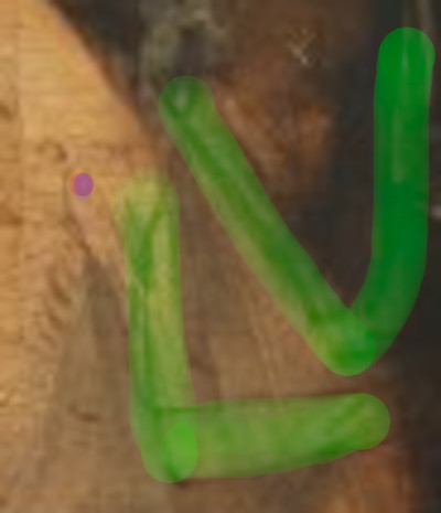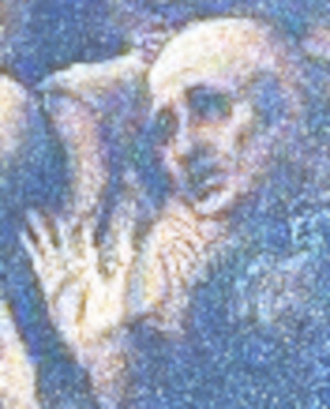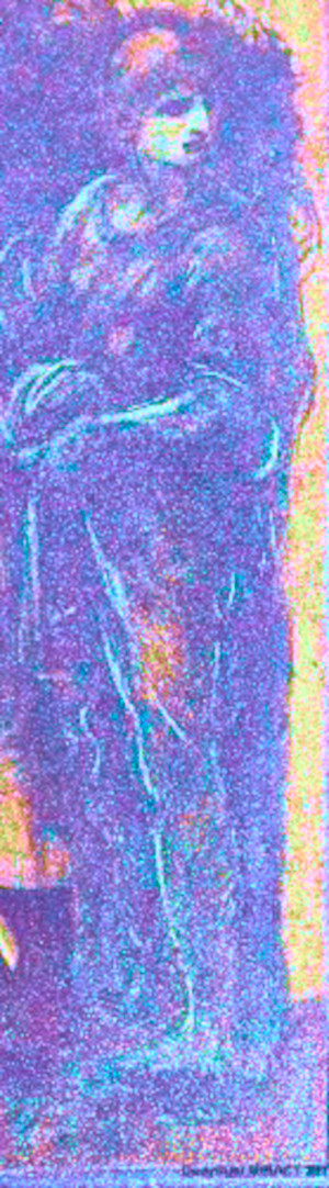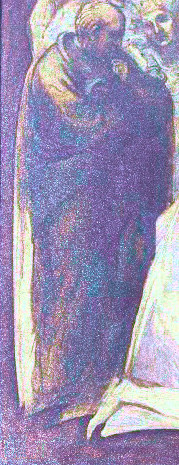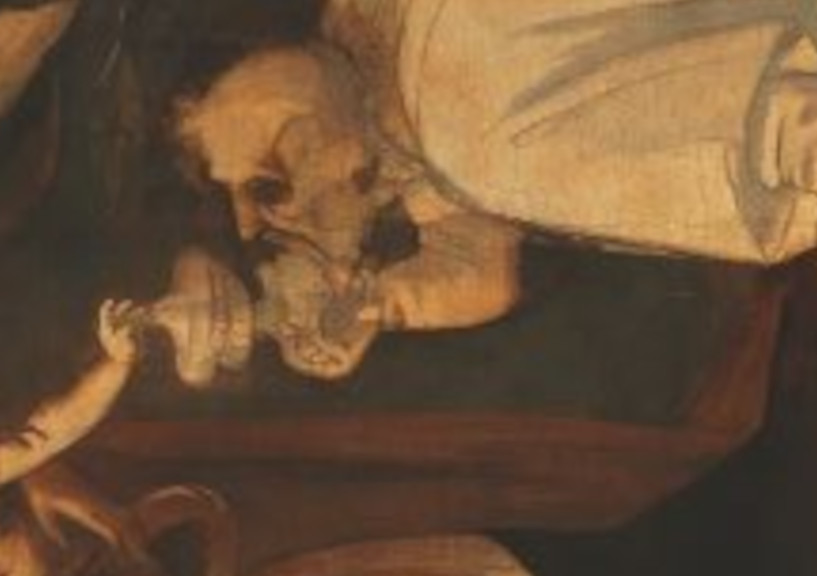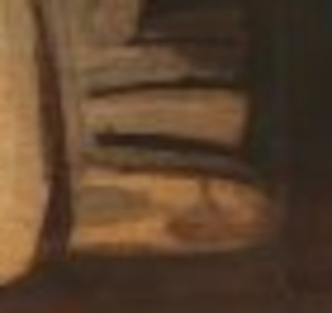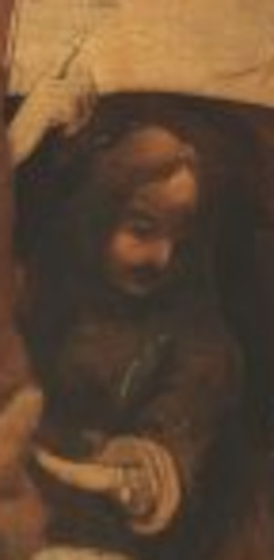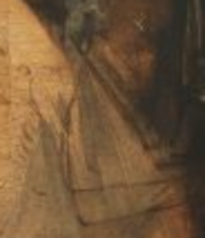 Observe the figure at the Virgin’s right shoulder, leaning forward and ringing a small bell. Another figure to note is the man behind the Virgin. He appears to hold a knife in his right hand. (arnolfinimystery.com)